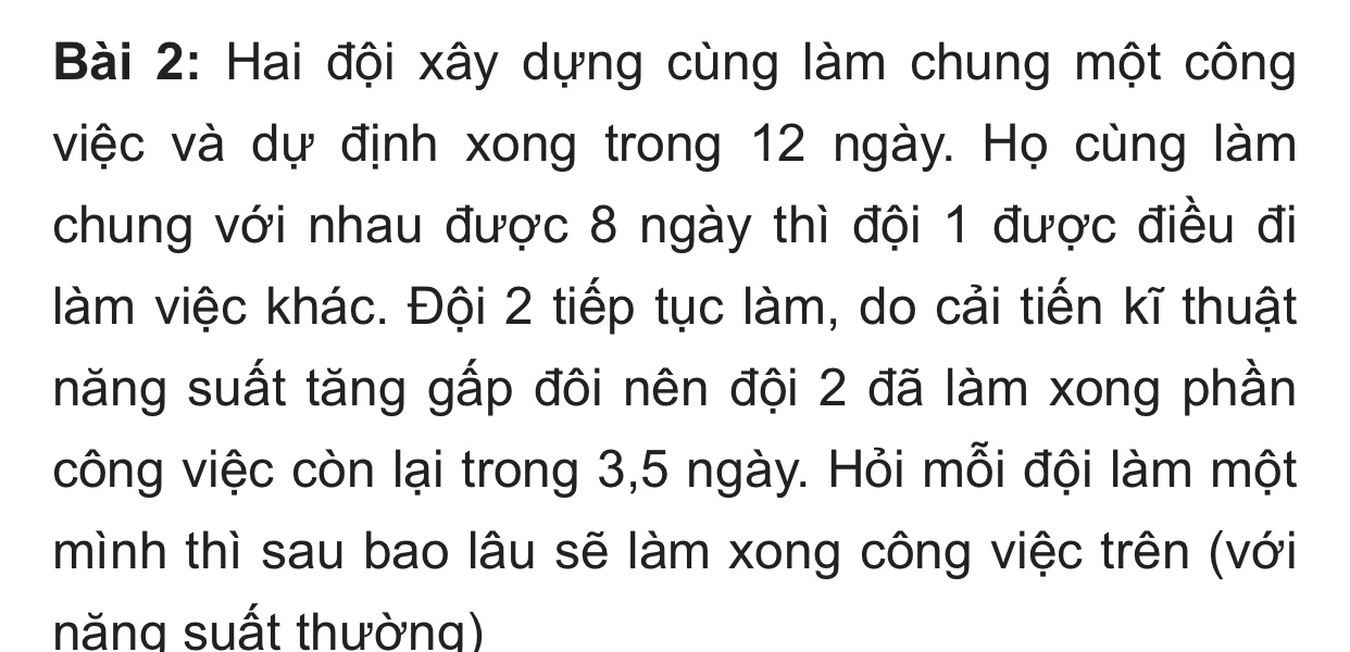Hai đội xây dựng cùng làm chung một công việc và dự định xong trong 12 ngày