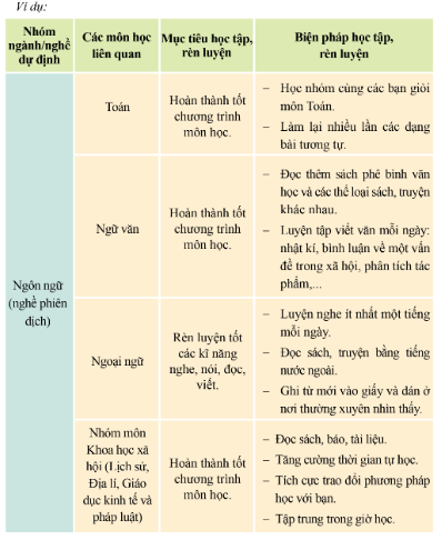 | Nhóm ngành/nghề dự định | Các môn học liên quan | Mục tiêu học tập rèn luyện | Biện pháp học tập, rèn luyện |