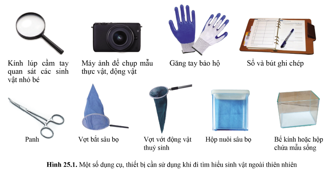 a) Quan sát hình 25.1 và cho biết cần chuẩn bị những dụng cụ, thiết bị gì khi đi tìm hiểu sinh vật ngoài thiên nhiên.