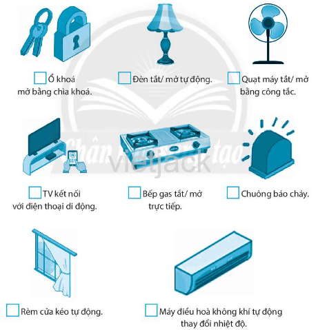 Câu 2 trang 14 sách bài tập Công nghệ 6: Đánh dấu √ vào ô trống trước những đồ dùng phù hợp với ngôi nhà thông minh