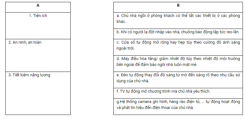 Câu 7 trang 16 sách bài tập Công nghệ 6: Nối các mô tả ở cột B với các đặc điểm của ngôi nhà thông minh ở cột A cho hợp lí