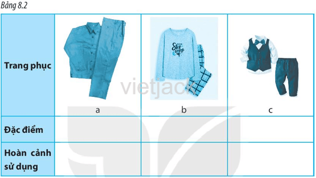 Sử dụng các cụm từ sau để mô tả đặc điểm các bộ trang phục trong Bảng 8.2 và