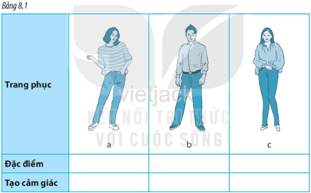 Sử dụng các cụm từ sau để mô tả đặc điểm của những chiếc áo trong Bảng 8.1 và chỉ ra ảnh hưởng của chúng đến cảm giác về vóc dáng người mặc: