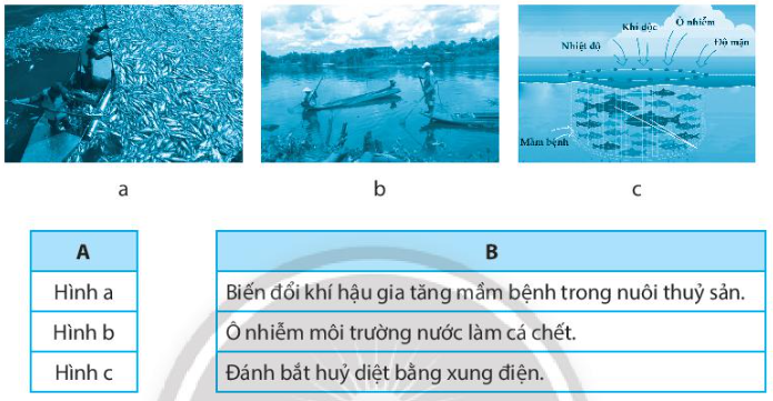 Câu 1 trang 70 SBT Công nghệ 7: Nối hình ảnh (cột A) với nguyên nhân làm ảnh hưởng môi trường và nguồn lợi thủy sản (cột B) cho phù hợp.