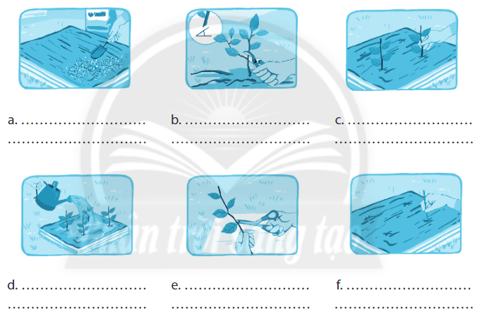 Câu 2 trang 18 SBT Công nghệ 7: Cho biết tên các công việc nhân giống cây trồng bằng phương pháp giâm cành được thể hiện trong mỗi hình dưới đây