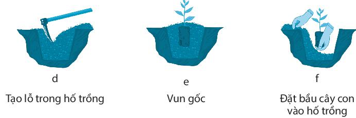 Câu 10 trang 34 SBT Công nghệ 7: Hãy gọi tên và nêu tác dụng của từng thao tác kĩ thuật trong quy trình trồng rừng bằng cây con rễ trần được thể hiện trong mỗi hình