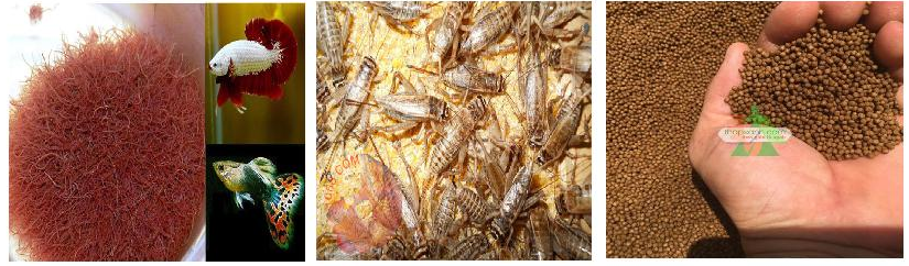 Câu 4 trang 50 SBT Công nghệ 7: Điền tên một số loại thức ăn nuôi cá cảnh vào chỗ “..“ trong hình dưới đây.