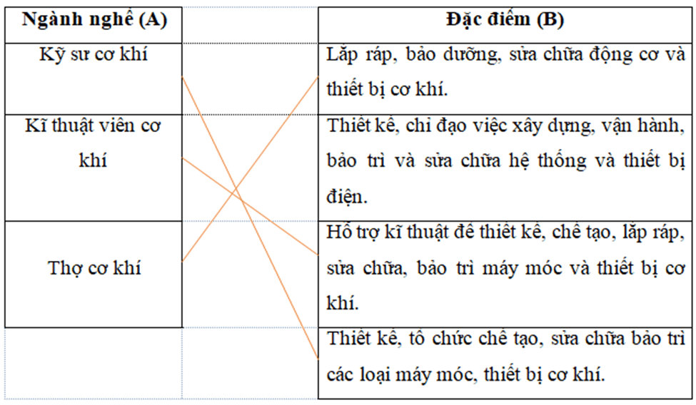Nối ngành nghề trong lĩnh vực cơ khí ở cột A với đặc điểm cơ bản của nghề ở cột B cho phù hợp.