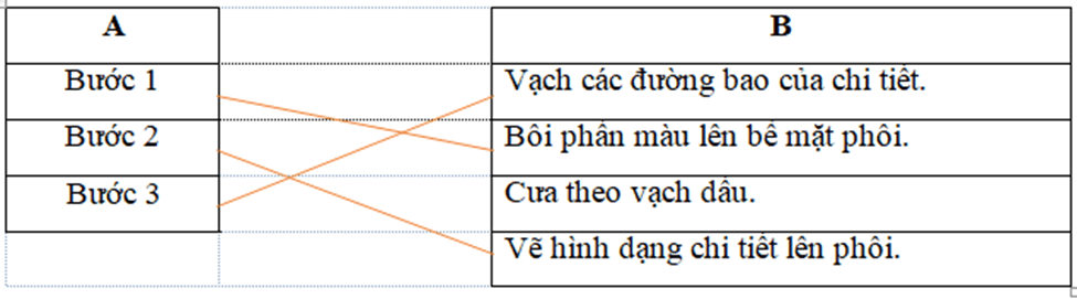 Câu 3 trang 37 SBT Công nghệ 8: Em hãy nối thứ tự bước thực hiện ở cột A với công việc ở cột B để thể hiện quy trình vạch dấu trên phôi cho phù hợp.