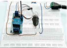 - Bước: 2 - Công việc: Kết nối bóng đèn sợi đốt vào mô đun cảm biến. - Yêu cầu kĩ thuật: Đảm bảo kết nối đúng vị trí tiếp điểm (đầu ra) của rơ le điện từ và tiếp xúc tốt. |