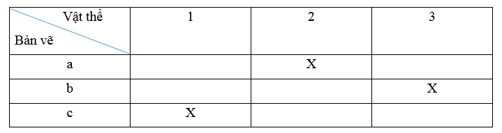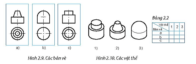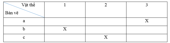 Câu 6 trang 8 SBT Công nghệ 8: Đọc các bản vẽ hình chiếu a, b, c ở Hình 2.9 và đối chiếu với các vật thể 1, 2, 3 trong Hình 2.10. Kẻ mẫu Bảng 2.2 vào vở rồi đánh dấu (x) vào ô tương ứng để chỉ rõ sự tương ứng giữa các bản vẽ và các vật thể.