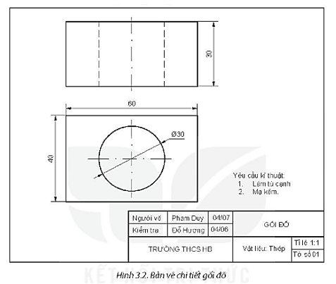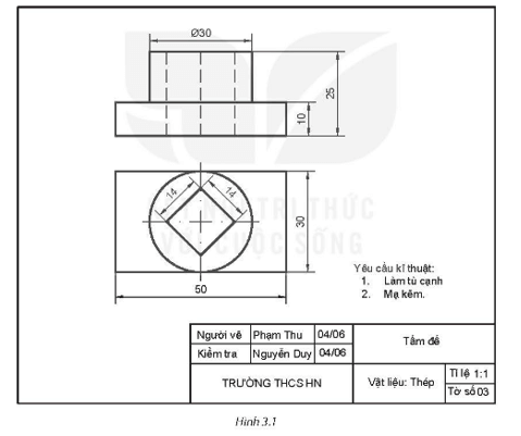 Câu 3 trang 9 SBT Công nghệ 8: Quan sát bản vẽ chi tiết trên Hình 3.1 và cho biết tên gọi của chi tiết, các yêu cầu kĩ thuật và mô tả hình dạng, kích thước của chi tiết đó.