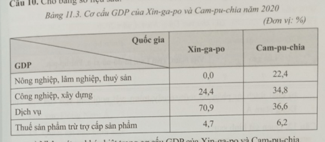a) Nhận xét sự khác biệt trong cơ cấu GDP của Xin-ga-po và Cam-pu-chia.
