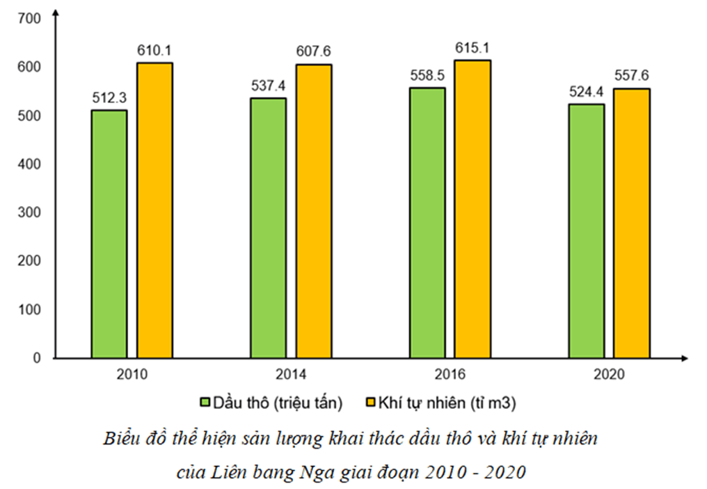 Câu 3 trang 49 SBT Địa Lí 11: Vẽ biểu đồ thể hiện sản lượng khai thác dầu thô và khí tự nhiên của Liên bang Nga giai đoạn 2010 - 2020.