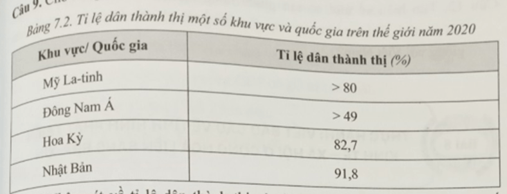 ♦ Yêu cầu a) Tỉ lệ dân thành thị của khu vực Mỹ La-tỉnh ở mức cao, cao hơn nhiều so với khu vực Đông Nam Á và gần bằng các nước phát triển như Hoa Kỳ, Nhật Bản