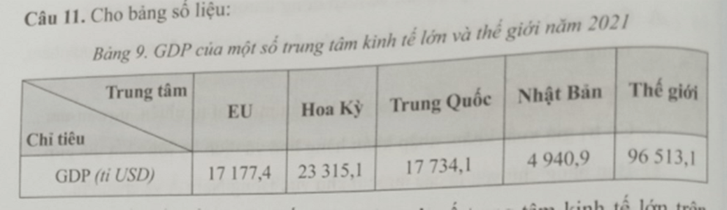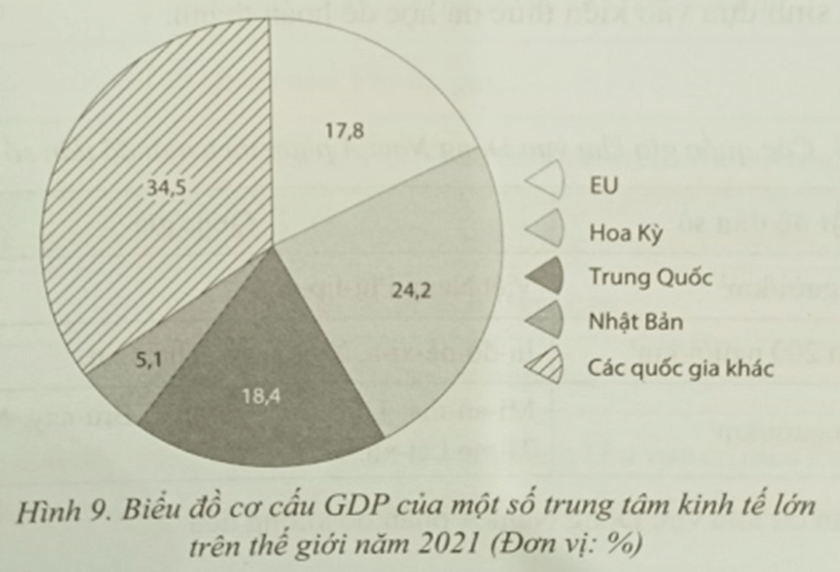 a) Vẽ biểu đồ thể hiện cơ cấu GDP của một số trung tâm kinh tế lớn trên thế giới năm 2021.