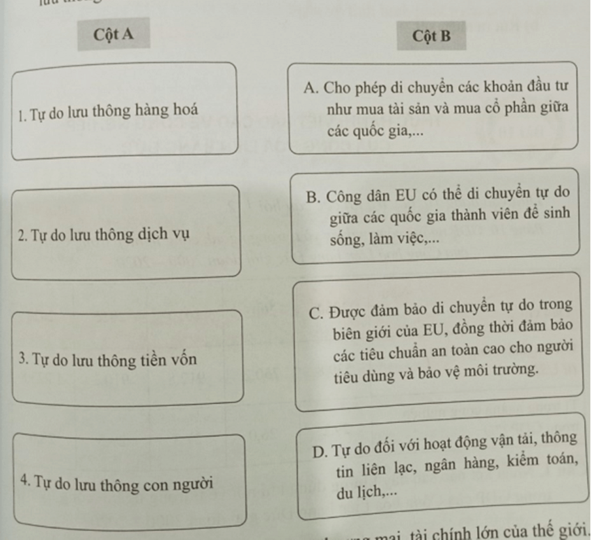 Câu 8 trang 23 SBT Địa Lí 11: Nối ý ở cột A với ý ở cột B sao cho đúng với biểu hiện của việc tự do lưu thông ở EU.