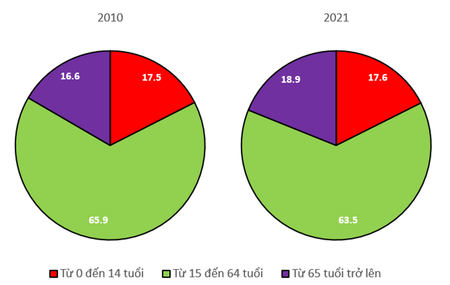 + Biểu đồ thể hiện cơ cấu dân số theo nhóm tuổi của nước Anh năm 2010 và 2021