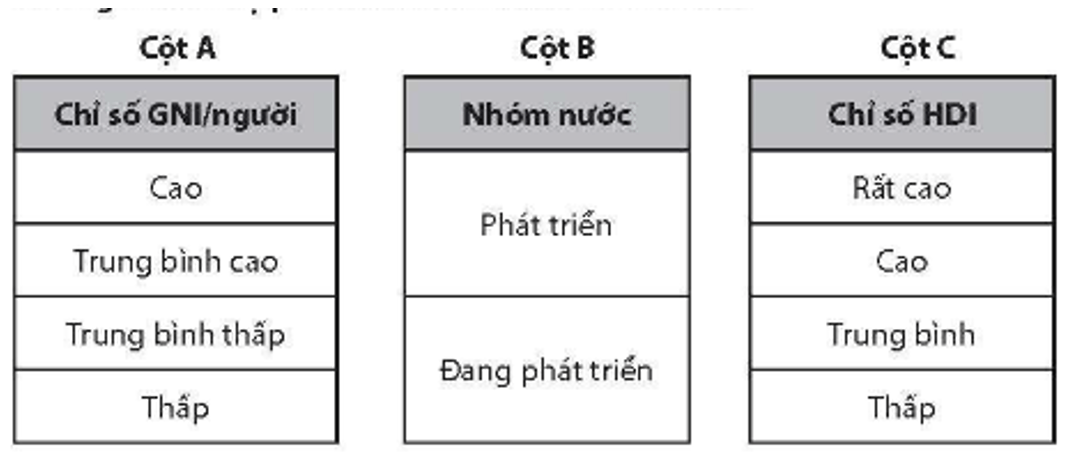 Câu 2 trang 6 SBT Địa lí 11: Nối các ý ở cột A, cột C với các ý ở cột B cho phù hợp về các chỉ tiêu đánh giá trình độ phát triển kinh tế các nhóm nước.
