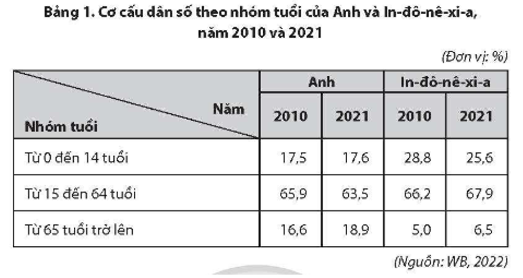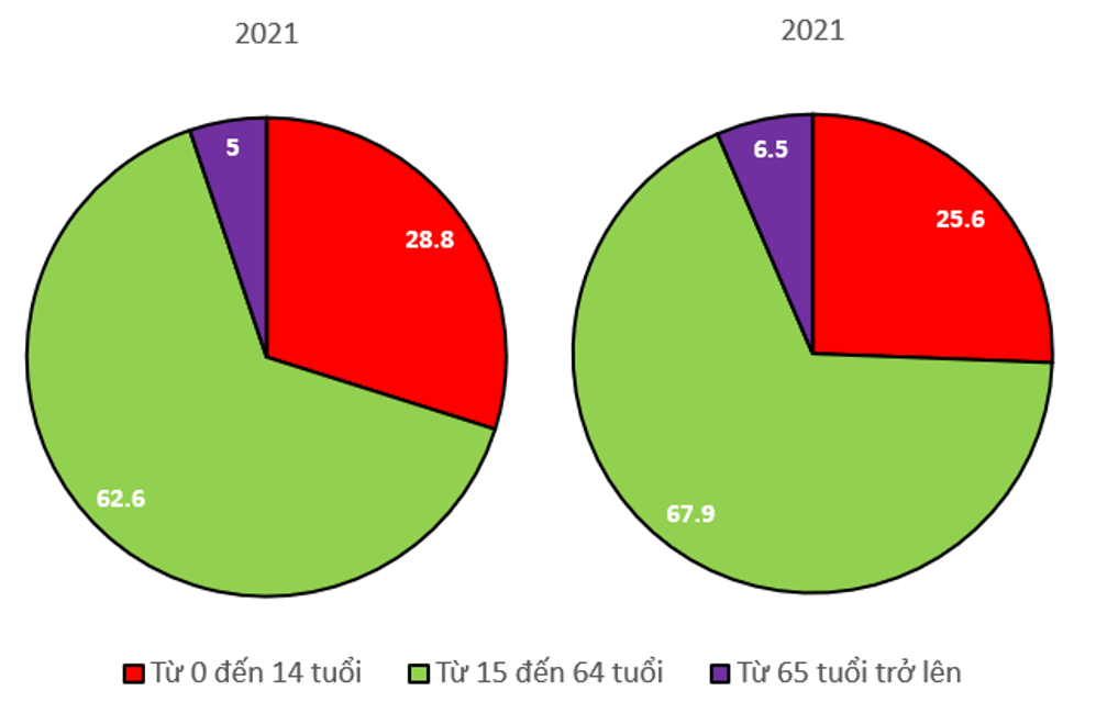 => Nhìn chung, ở cả hai nước, nhóm tuổi từ 15 - 64 tuổi đều chiếm tỉ trọng lớn nhất và tuy nhiên đang có xu hướng già hóa dân số.