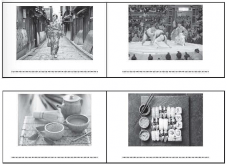 1. Ghi tên của những nét văn hoá truyền thông nổi tiếng của Nhật Bản vào chỗ trống (......) dưới mỗi hình.