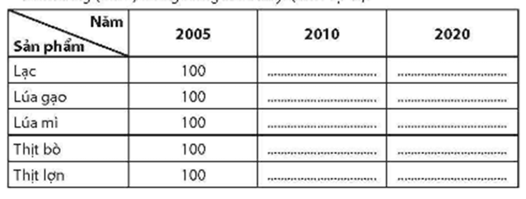 1. Tính tốc độ tăng trưởng của các sản phẩm nông nghiệp Trung Quốc, giai đoạn 2005 – 2020 (lấy năm 2005 bằng 100%) và điền kết quả vào chỗ trống (....) trong bảng dưới đây. (Đơn vị: %).