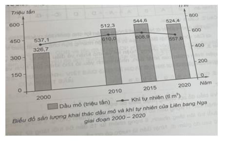 - Vẽ biểu đồ thể hiện sản lượng khai thác dầu mỏ và khí tự nhiên của Liên bang Nga giai đoạn 2000 - 2020.
