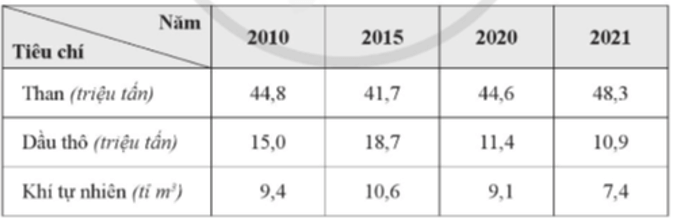 Bảng 13. Sản lượng khai thác than, dầu thô và khí tự nhiên của nước ta giai đoạn 2010-2021