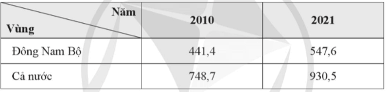 Diện tích cao su của vùng Đông Nam Bộ tăng trung bình mỗi năm trong giai đoạn 2010 - 2021 là (547,6 - 441,4) : 11 = 9,7 nghìn ha.