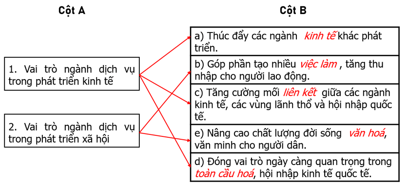 Câu 3. Điền các từ hoặc cụm từ thích hợp cho sẵn vào chỗ trống (.....) để hoàn thành nội dung cột B. Sau đó, nối các ý ở cột A với các ý ở cột B cho phù hợp với vai trò của ngành dịch vụ ở nước ta.