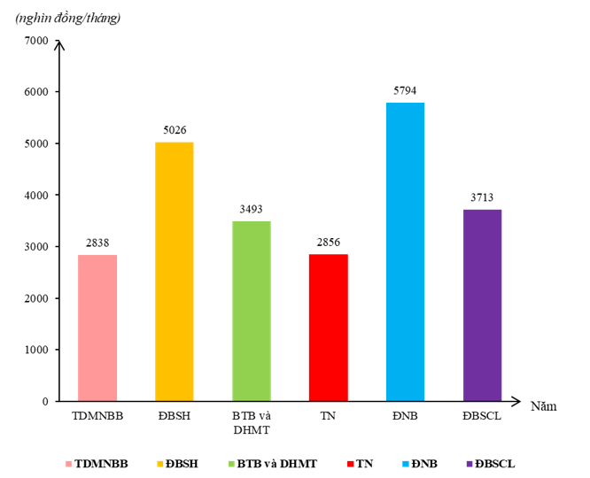 Biểu đồ thể hiện thu nhập bình quân đầu người một tháng (theo giá hiện hành) của các vùng kinh tế ở nước ta, năm 2021.