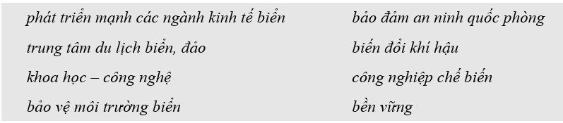 Câu 5. Sử dụng các từ hoặc cụm từ thích hợp cho sẵn để viết một đoạn thông tin về hướng phát triển các ngành kinh tế biển của Duyên hải Nam Trung Bộ.