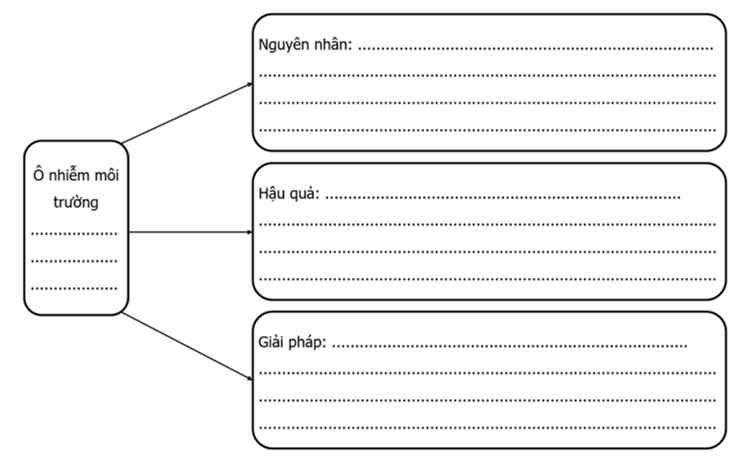 Câu 1. Thu thập và hoàn thành thông tin về một vấn đề ô nhiễm môi trường (không khí, nước, đất,...) ở nước ta (hoặc địa phương em sinh sống) vào sơ đồ dưới đây.