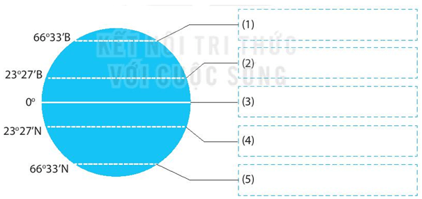 Hãy chú thích cho hình sau dựa vào các dữ liệu: Xích đạo, chí tuyến Bắc, chí tuyến Nam, vòng cực Bắc, vòng cực Nam.