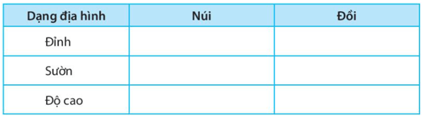 Hoàn thành bảng theo mẫu dưới đây để so sánh đặc điểm của núi và đồi.