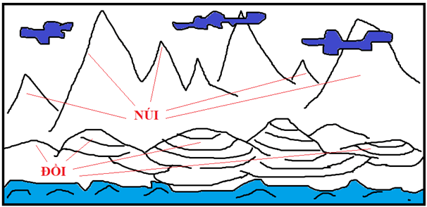 Dựa vào các đặc điểm đã nêu ở câu 1, hãy vẽ hình thể hiện một quả núi và một quả đồi.