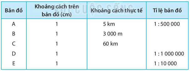 - Với bản đồ có tỉ lệ 1 : 1 000 000, tức là 1 cm trên bản đồ bằng 1 000 000 cm ngoài thực tế, khoảng cách trên bản đồ giữa A và B là: 50 000 000 : 1 000 000 = 50 cm. Tương tự, ta có bảng kết quả sau:
