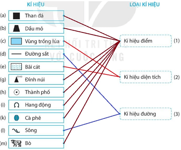 - Các loại kí hiệu được thể hiện trong bảng chú giải: kí hiệu diện tích, kí hiệu điểm, kí hiệu đường.