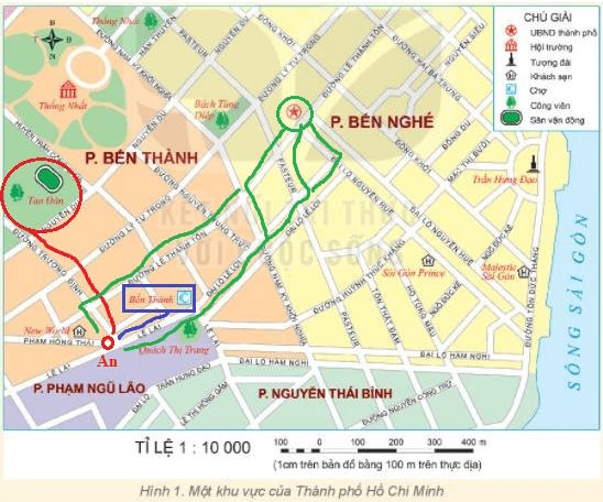 Em hãy dựa vào bản đồ hành 1 SGK (trang 107) để chỉ đường (lộ trình, chiều dài quãng đường) cho bạn An đến: