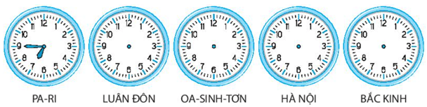 Em hãy giải thích cho sự khác nhau giờ ở các địa điểm. Cho đồng hồ của Pa-ri chỉ đúng giờ, em hãy cho biết giờ của Luân Đôn, Oa-sinh-tơn, Hà Nội, Bắc Kinh.