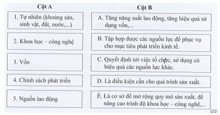 Câu 4 trang 33 SBT Địa Lí 10: Nối ý ở cột A (nguồn lực) với ý ở cột B (vai trò) sao cho đúng.