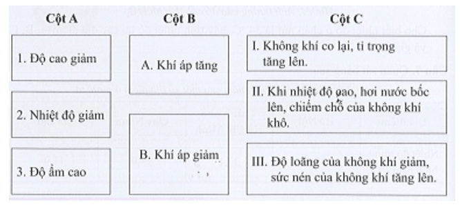 Câu 4 trang 16 SBT Địa Lí 10: Nối ý ở cột A (nhân tố) với ý ở cột B (nguyên nhân) và cột C (sự thay đổi của khí áp) sao cho đúng.