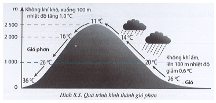 - Khi gió mát và ẩm thổi tới một dãy núi, bị dãy núi chặn lại, không khí ẩm bị đẩy lên cao, nhiệt độ giảm (trung bình lên 100 m nhiệt độ giảm 0,6°C); đến một độ cao nhất định, hơi nước ngưng tụ tạo thành mây và gây mưa.