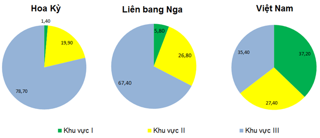 Biểu đồ thể hiện cơ cấu dân số phân theo khu vực kinh tế của Hoa Kỳ, Liên bang Nga và Việt Nam, năm 2019