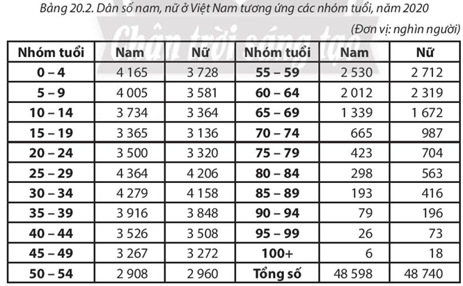 Bài tập 5 trang 70 SBT Địa lí 10: Cho bảng số liệu 20.2, em hãy tính cơ cấu dân số theo giới tương ứng với 3 nhóm tuổi của Việt Nam để hoàn thành bảng bên dưới.