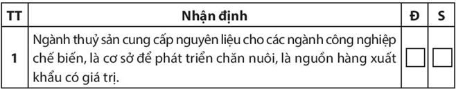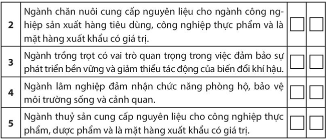 Bài tập 4 trang 90 SBT Địa lí 10: Những nhận định sau đây về vai trò của ngành nông nghiệp, lâm nghiệp, thuỷ sản là đúng (Đ) hay sai (S)? Hãy đánh dấu (X) vào các ô tương ứng bên cạnh mỗi nhận định