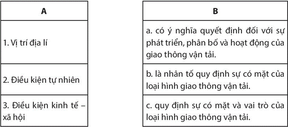 Câu 3: Ảnh hưởng của điều kiện tự nhiên đến sự phát triển và phân bố ngành giao thông vận tải thể hiện qua ý nào sau đây?