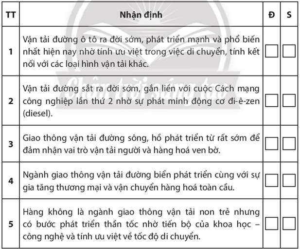Bài tập 5 trang 121 SBT Địa lí 10: Những nhận định sau đây về tình hình phát triển các ngành giao thông vận tải là đúng (Đ) hay sai (S)? Hãy đánh dấu (X) vào các ô tương ứng bên cạnh mỗi nhận định.