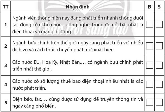Bài tập 5 trang 124 SBT Địa lí 10: Những nhận định sau đây về tình hình phát triển và phân bố ngành bưu chính viễn thông là đúng (Đ) hay sai (S)? Hãy đánh dấu (X) vào các ô tương ứng bên cạnh mỗi nhận định.