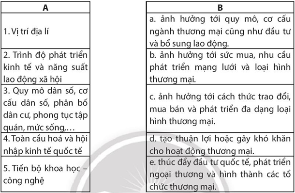 Bài tập 4 trang 128 SBT Địa lí 10: Em hãy nối các ý ở cột A cho phù hợp với các ý ở cột B về các nhân tố ảnh hưởng tới sự phát triển và phân bố ngành thương mại.